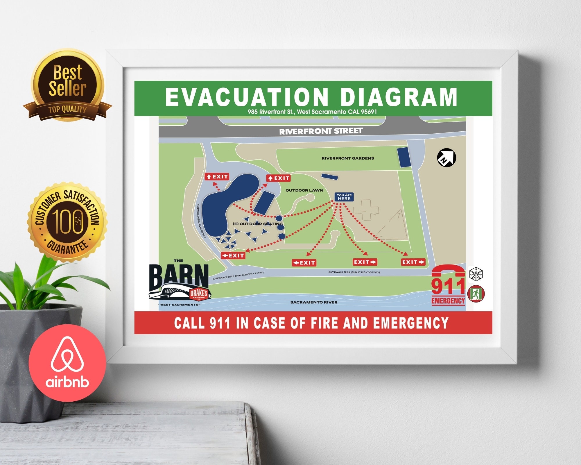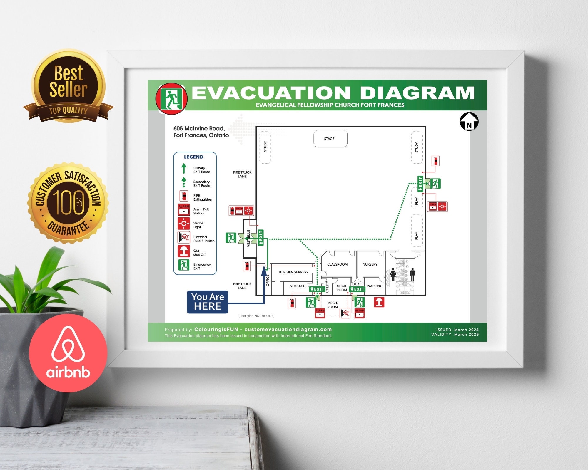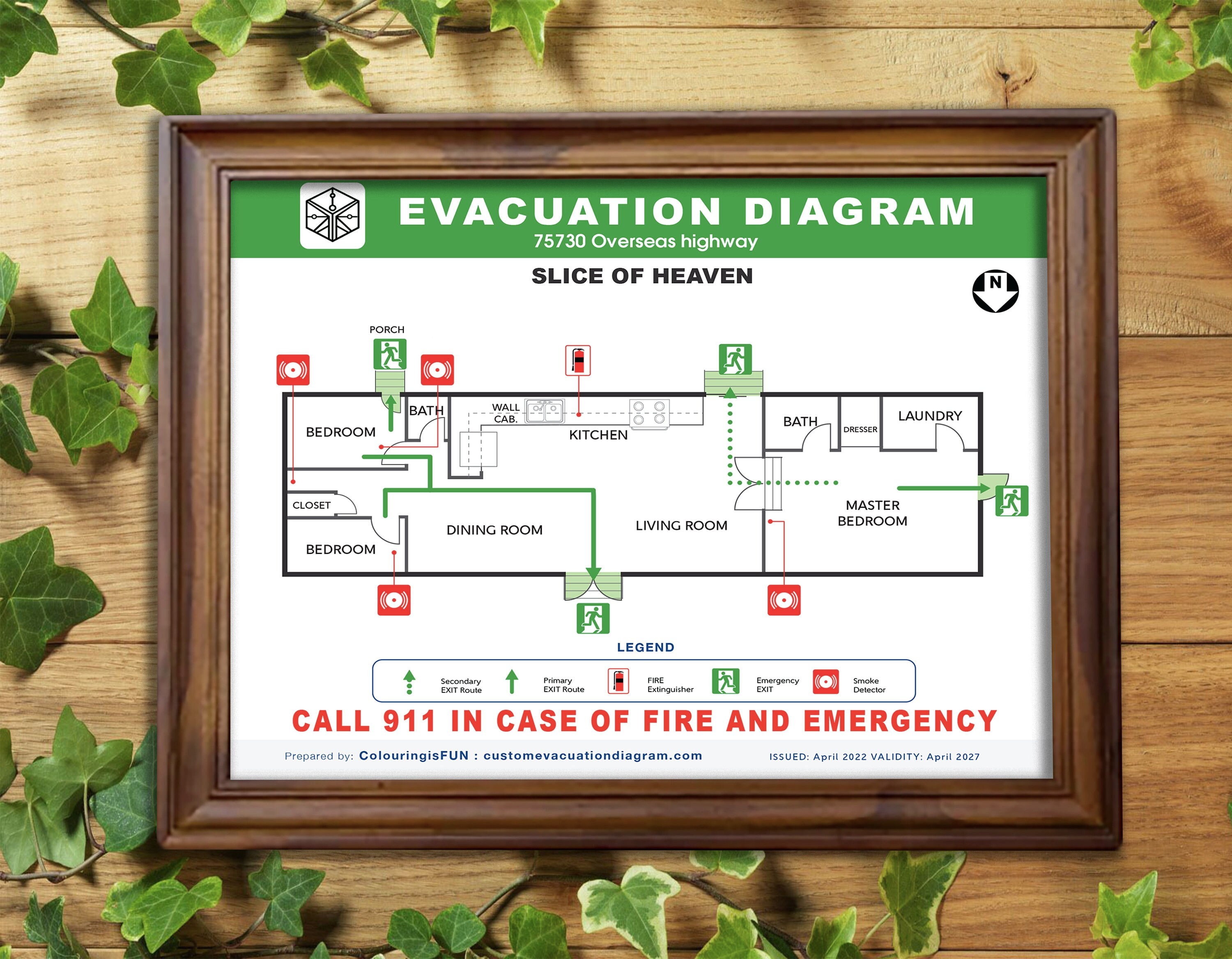 A simple and elegant evacuation diagram, Site Plan Diagram, fire scape route, fire plan with customized floor plan just for you. It is downloadble PDF files with sizes you need, either A4 size 8.5"x11" or bigger upon request. It is readable and easy to understand that even a child can decipher. The fire extinguisher, medical kit, smoke detector and similar items should be mark up to be included in your evacuation diagram.