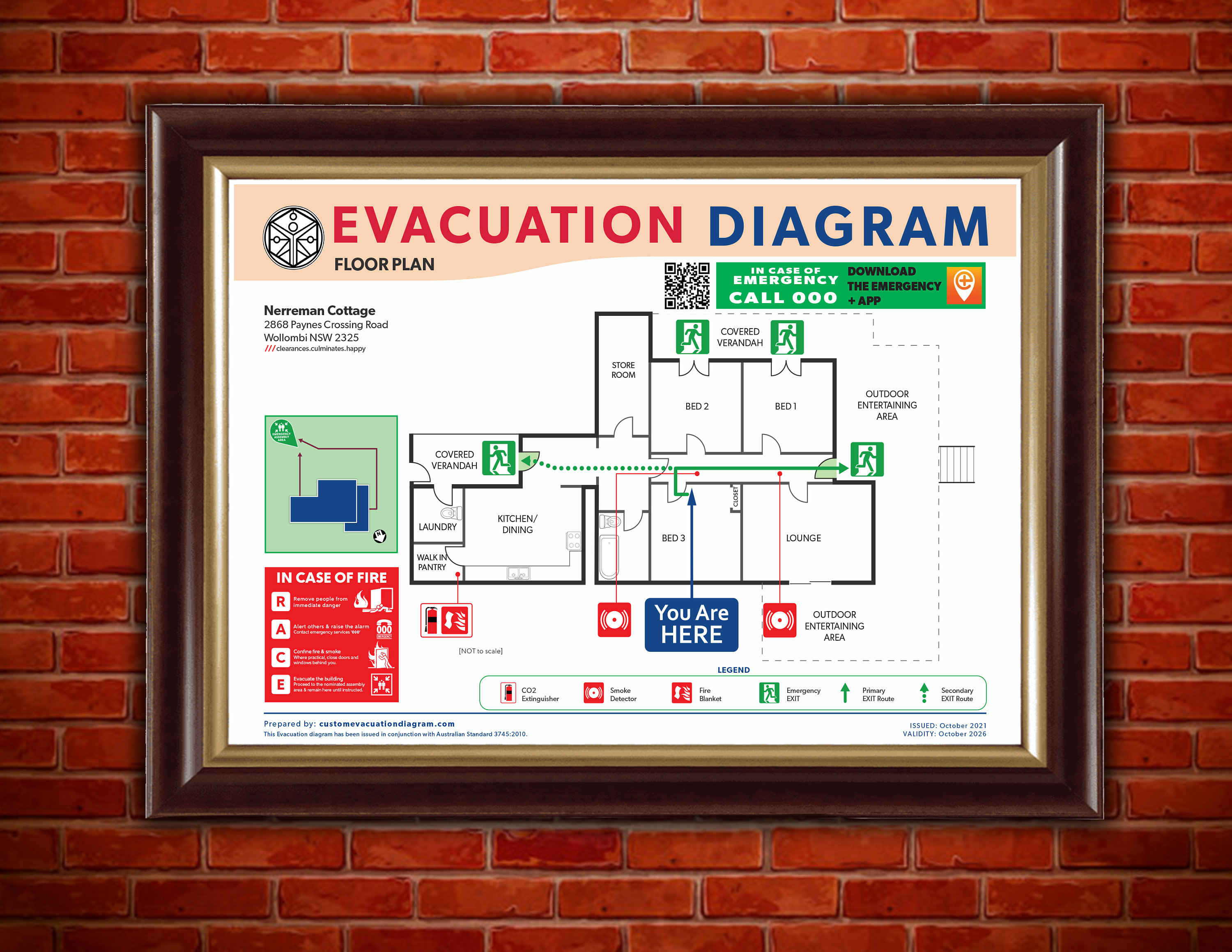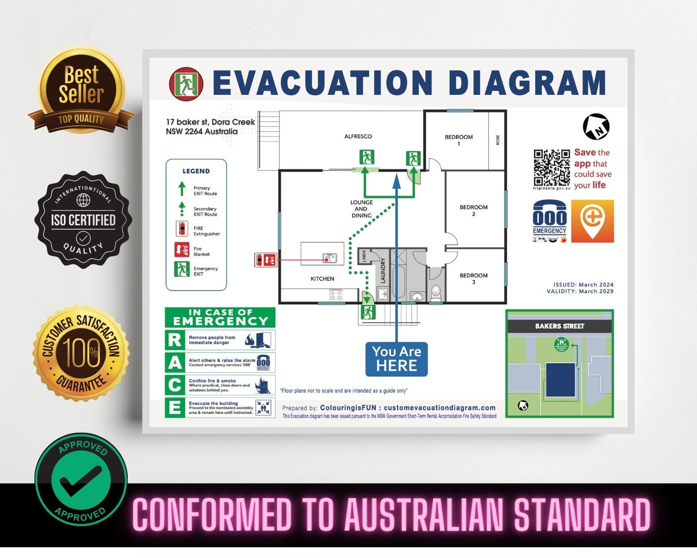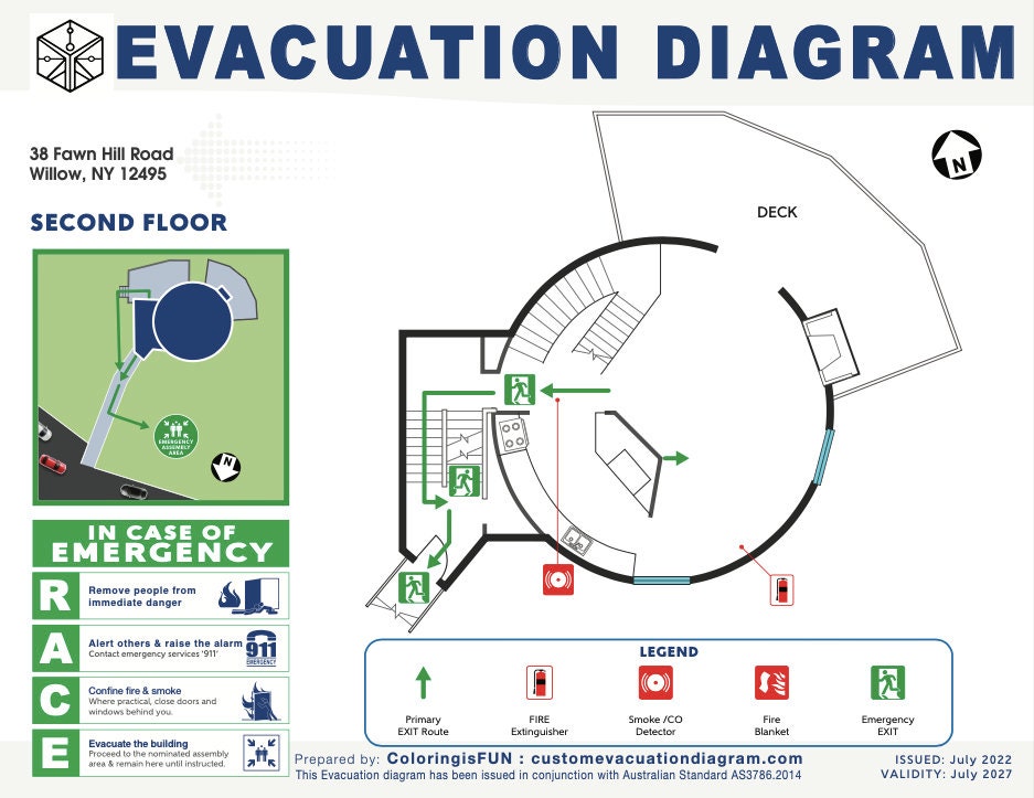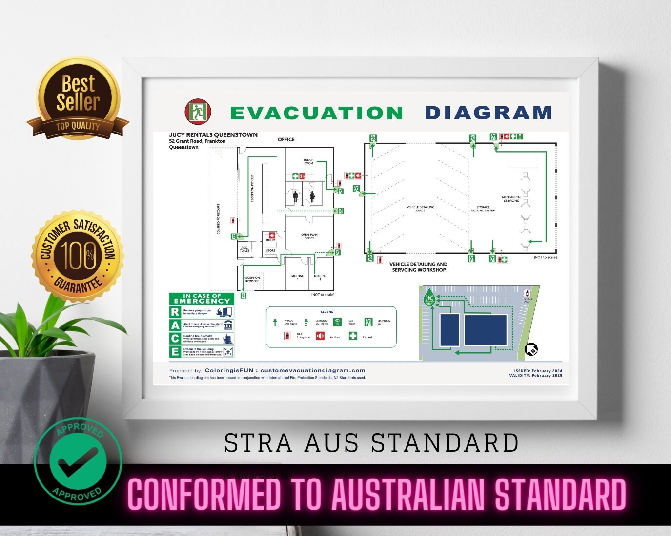Step into the vicinity of your property where safety is paramount and peace of mind is guaranteed. Picture sleek, meticulously crafted evacuation diagrams adorning the walls of every corridor and rooms, exit and entrances, each one a beacon of preparedness and assurance. With the latest and most updated information at your fingertips, these diagrams seamlessly guide you through escaping potential emergencies and life threatening situations with clarity and precision. Bold symbols and intuitive pathways promise swift and secure evacuation, leaving no room for uncertainty. In this environment, safety isn't just a priority—it's a promise fulfilled, ensuring that every individual can navigate crises confidently and emerge unscathed.